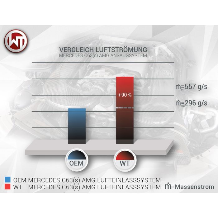 Mercedes A205 C63 (S) AMG 350–375 kW/476–510 PS (2016–2020) Kod silnika: M 177 DE 40 AL System WagnerTuning Air-Intake jest bezpośrednim zamiennikiem fabrycznego układu i eliminuje wszystkie wąskie gardła OEM. Zoptymalizowane pod kątem przepływu karbonowe kanały dolotowe ram air, karbonowe pokrywy airboxów oraz dolne części airboxów z powiększonymi panelowymi filtrami zapewniają najlepsze możliwe parametry przepływu, eliminując zbędne ograniczenia i zawirowania. Wysokowydajne filtry powietrza, większe o 58% względem OEM, gwarantują doskonały przepływ przy zachowaniu świetnej filtracji. Ten system Air-Intake oferuje poprawę masowego przepływu powietrza o 90% w porównaniu z OEM. Reakcja silnika i moc ulegają znaczącej poprawie.